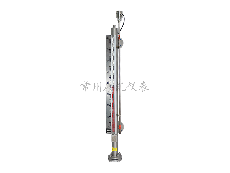 磁性翻柱液位計由浮子、立管組件、指示器三部分組成。浮子在立管組件內隨液位的變化而上升或下降,通過磁耦合作用,帶動立管組件外的指示器顏色發生變化(液紅氣白),從而指示出液位高度。液位報警開關安裝在立管組件外部相應的報警位置上,當浮子隨液位到達報警位置時,報警開關閉合,發出開關信號;液位遠傳變送器也安裝在立管組件外部,通過磁耦合將液位的變化線性地轉換成4—20mA電流信號遠傳給控制室,實現液位的顯示、測量、控制和記錄。